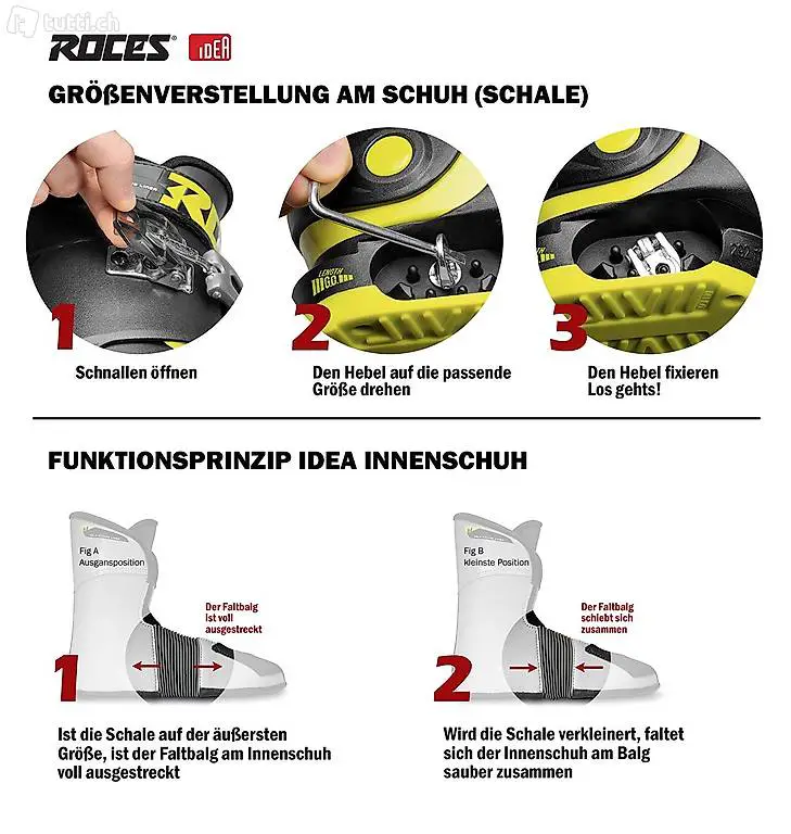Weil Ihre Kinder schnell wachsen und jede Saison eine neue Skiausrüstung brauchen, bietet Roces eine praktische und einzigartige Lösung an. Der Roces IDEA Schuh ist der einzige Skischuh der mit dem Fuss Ihres Kindes mitwächst.