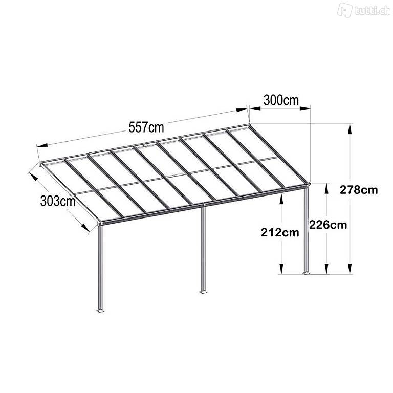 Wir haben bewusst 5 verschiedene Breiten im Angebot, damit fast jeder gewünschte Anbauort flächenmässig möglich ist. Das gesamte Terrassendach ist als Bausatz konstruiert. Dieser beinhaltet alle benötigten Teile: Sichtschienen aus Aluminium (nichtrostend, leicht und sehr stabil) . Hinzu kommen Verbindungsplatten, Winkel, U-Schienen,