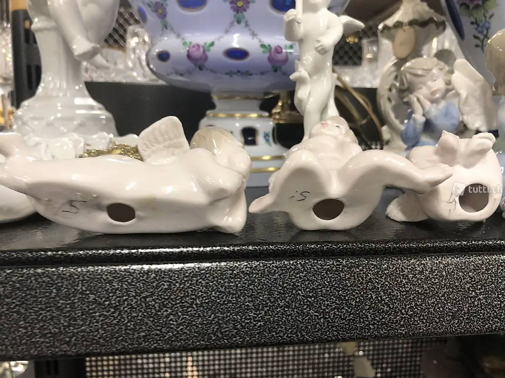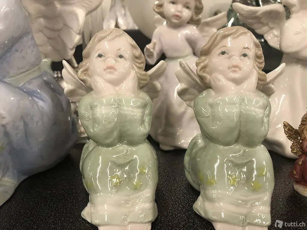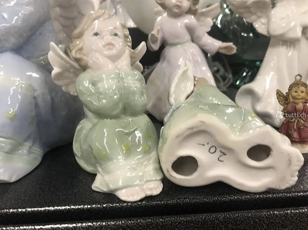 3 kleine Weisse und 2 Grüne Engel Porzellan