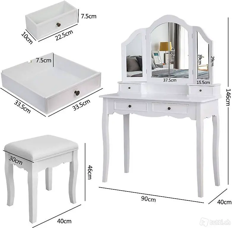 Grösse von Schminktisch: 90 x 40 x 146 cm (L x B x H) , Grösse von Hocker: 40 x 30 x 46 cm (L x B x H, Höhe mit Sitzkissenhöhe)