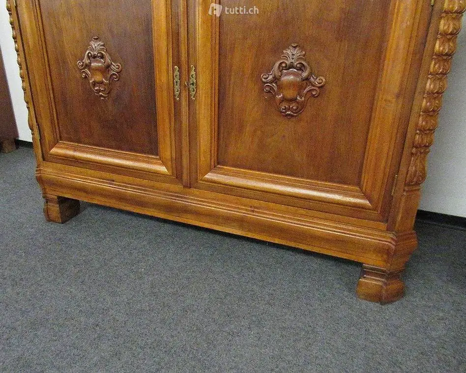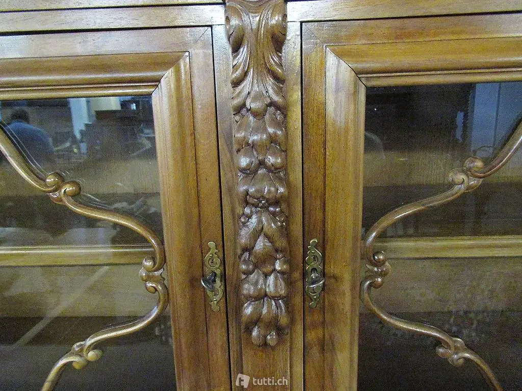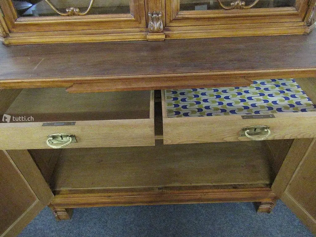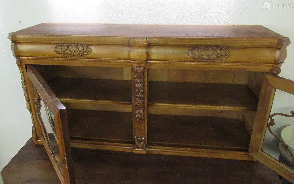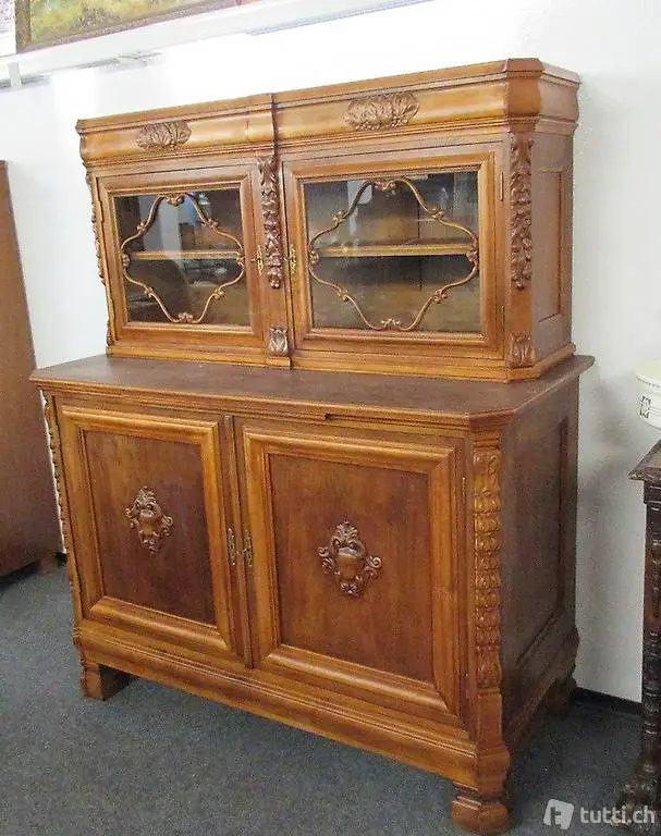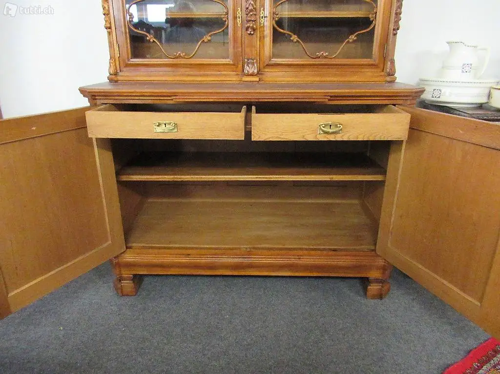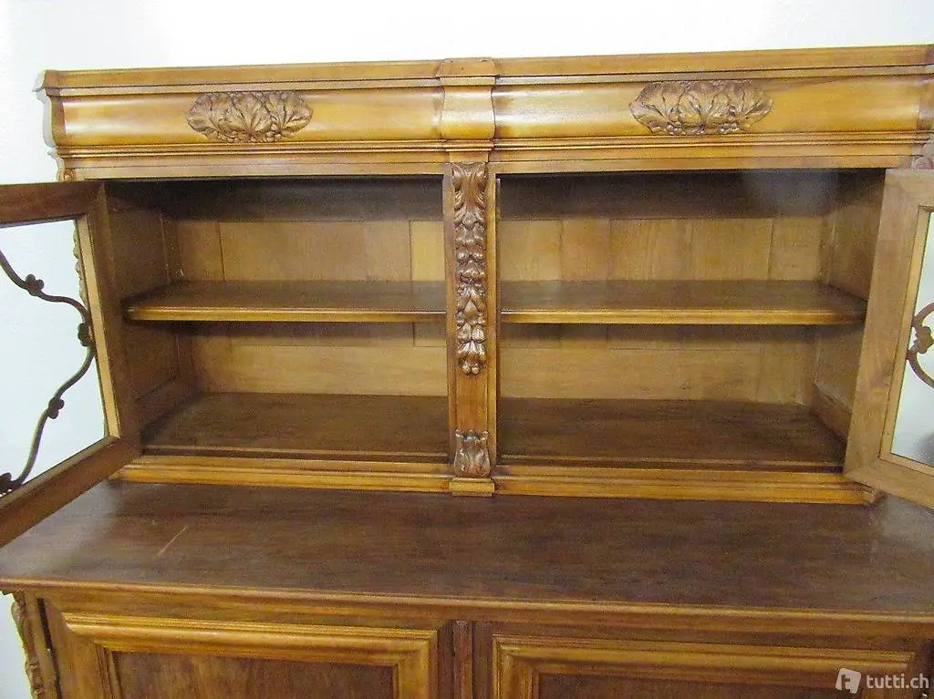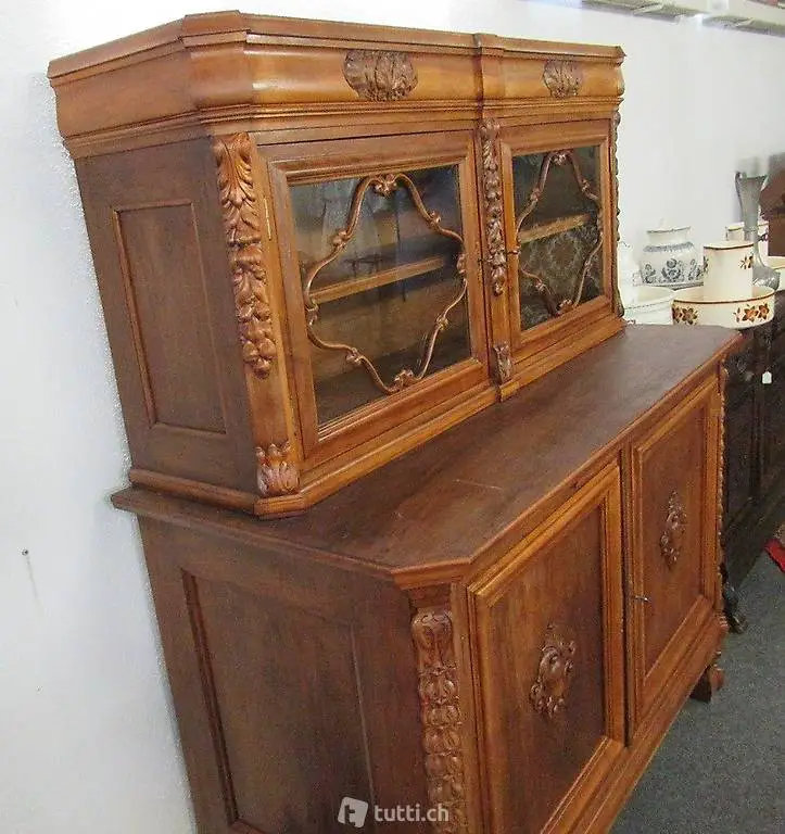 Wunderschönes Büffet mit Vitrinenaufsatz und teilrestariert mit schönen Verzierungen. Wohnfertig zum sofortigen Gebrauch. Das zukünftige schmuckstück ihrer Wohnung. Zwei-Teilig. 145 x 67 x 103/172 cm. Besichtigung und Abholung bei Flums Antik oder Lieferung / Versand 100 Franken.