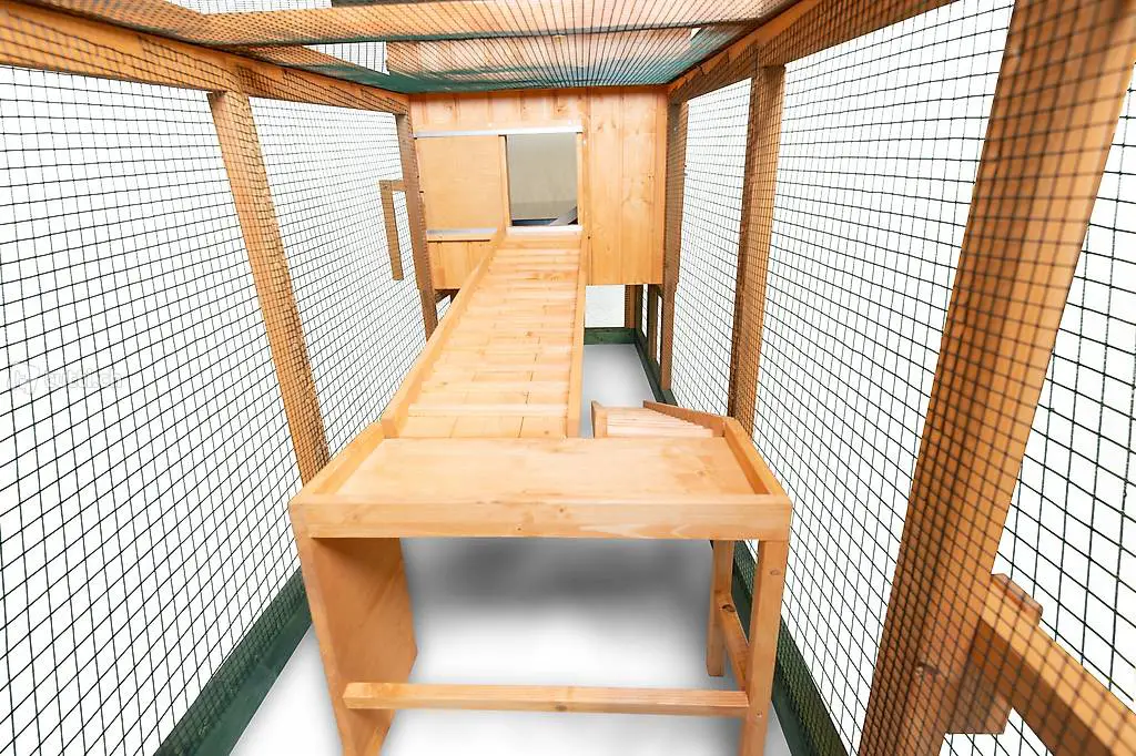 Rückwand ist der Auslaufschieber, welcher bequem über einen optionalen Türautomaten geöffnet bzw. geschlossen werden kann. Die Hühner gelangen über eine Auslauftreppe in den Auslauf. Der Auslauf ist mit mardersicherem