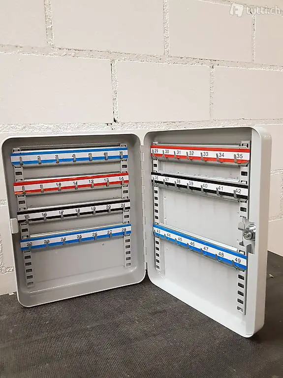 Einfacher Schlüsselkasten zur Aufbewahrung von bis zu 49 Schlüsseln. Wandmontage über Rückwandbohrungen möglich - auch in einem Möbel/Schrank montierbar. Die Hakenleisten sind im Raster höhenverstellbar.