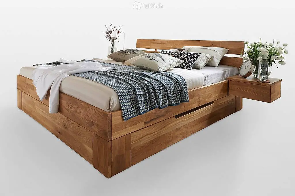 Schubladenbett «NXT» Wildeiche massiv natur geölt.