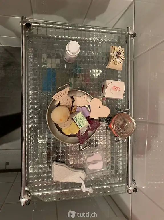aus Metall mit 3 Glastablaren auf Rollen.