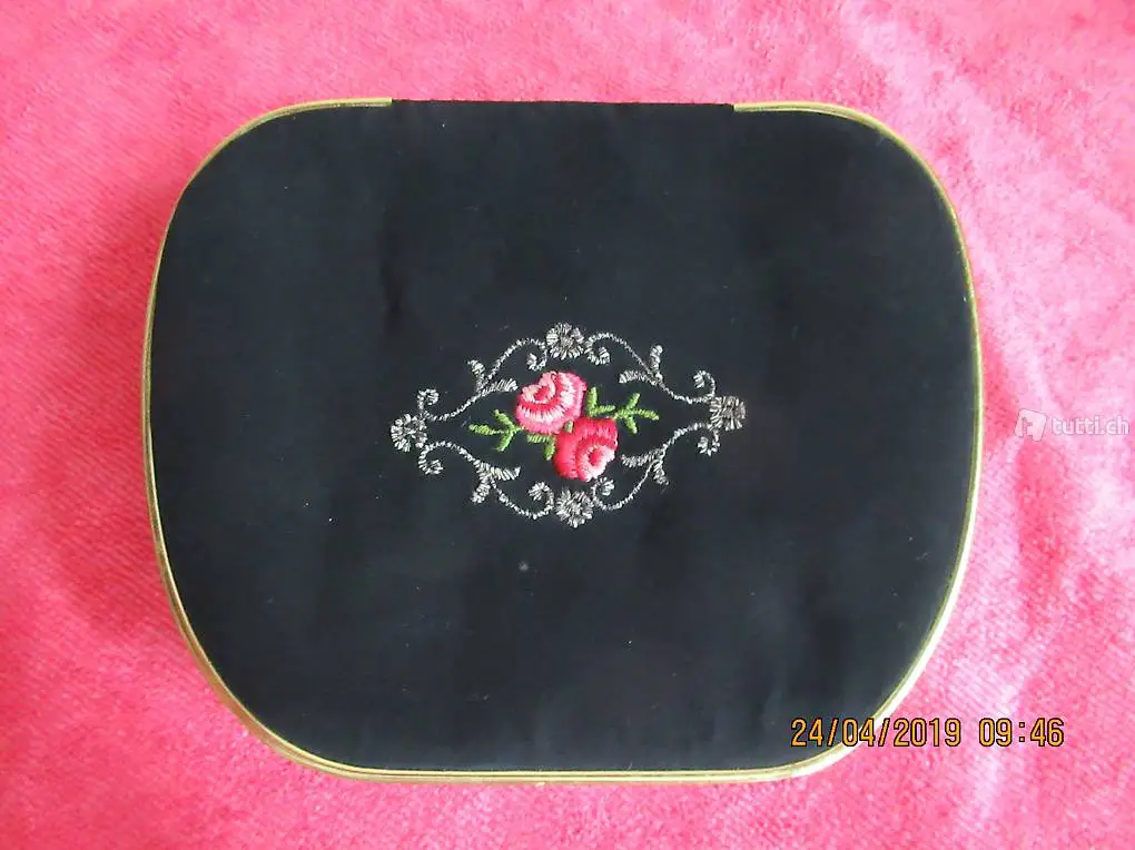 Schmuck, Seidenkoffer bestickt mit Rosen, Öffnung mit