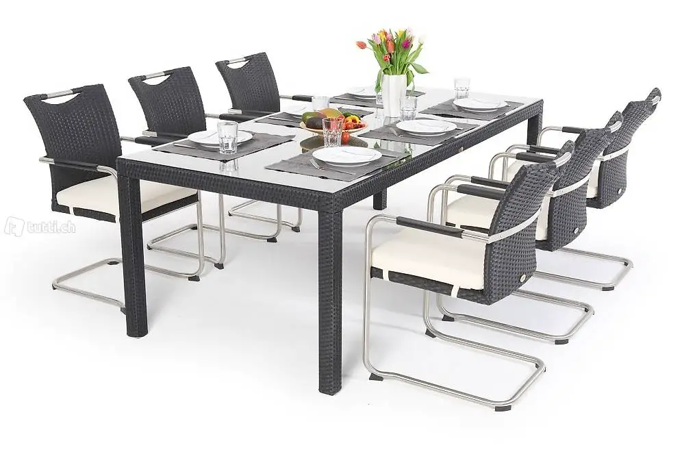 Mit dem Nevia Rattan Tischset liegen Sie absolut im Trend! Das Esstischset beinhaltet einen praktischen Tisch in der Grösse 220x100cm und sechs Swing Stühle. Neben dem exzellenten Sitzkomfort besitzt das Rattan Tischset auch eine absolut elegante Optik. Diese Rattan Sitzgruppe passt durch seine klassische Farbe in jeden Wohnbereich sowie Garten und verspricht gemütliche Stunden und ein entzückendes Ambiente.
