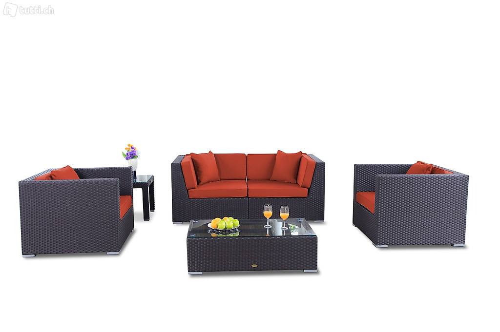 Polsterbezüge in einer anderen Farbe wie Rot, sowie weitere Sitzmöbel um die Rattan Lounge zu vergrössern, kann dazu bestellt werden.