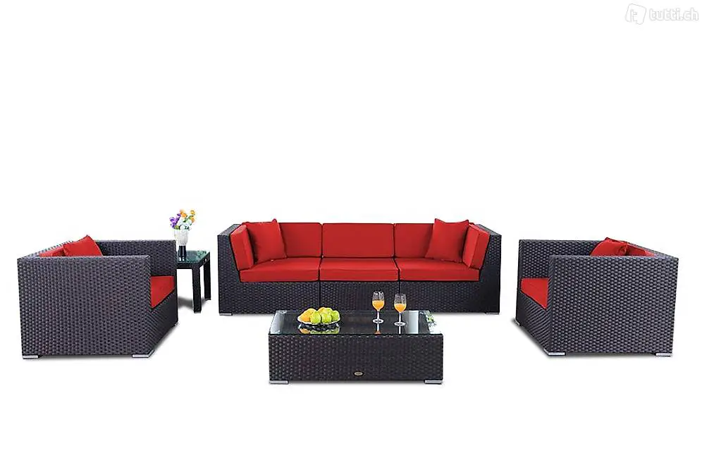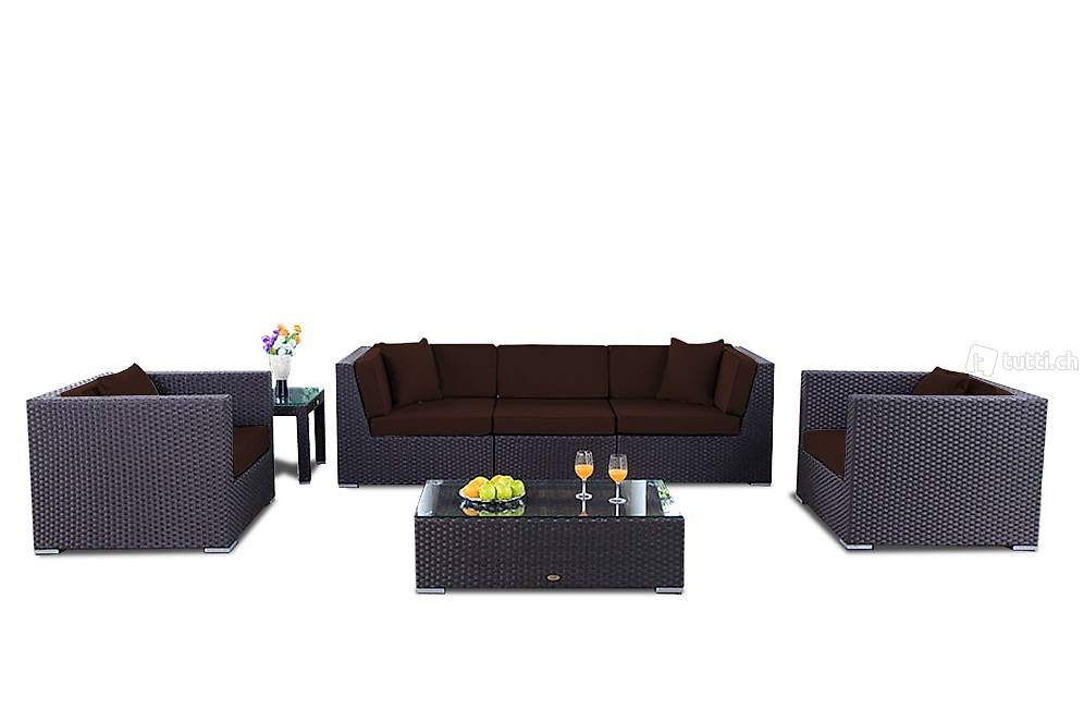 Die 7-teilige Rattan Lounge besteht aus einem 3er Sofa und zwei Chefsessel. Das hochwertige Kunststoffgeflecht (Poly-Rattan) ist wetterbeständig und pflegeleicht. Die sehr schön verarbeiteten Gartenmöbel sind mit einem Aluminium Rahmen versehen.