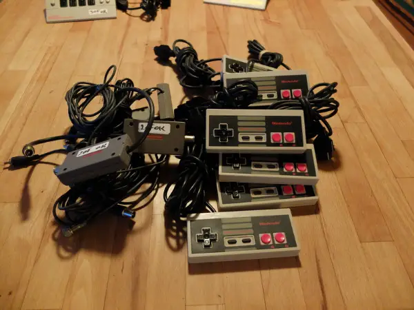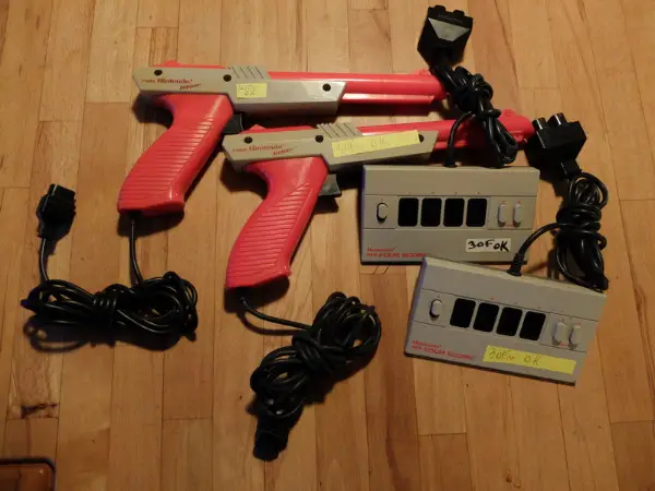 manettes, pistolet, cables tv, four score