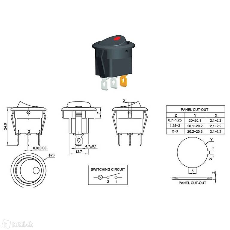 Kippschalter mit roter LED12V 20A / Schalter für Einbau / Einbauschalter