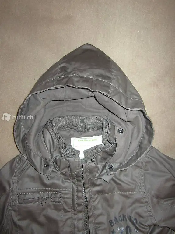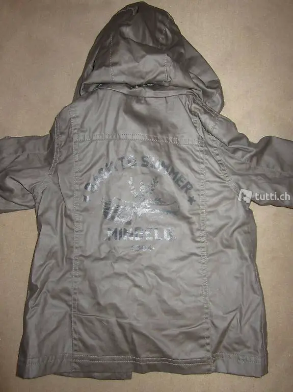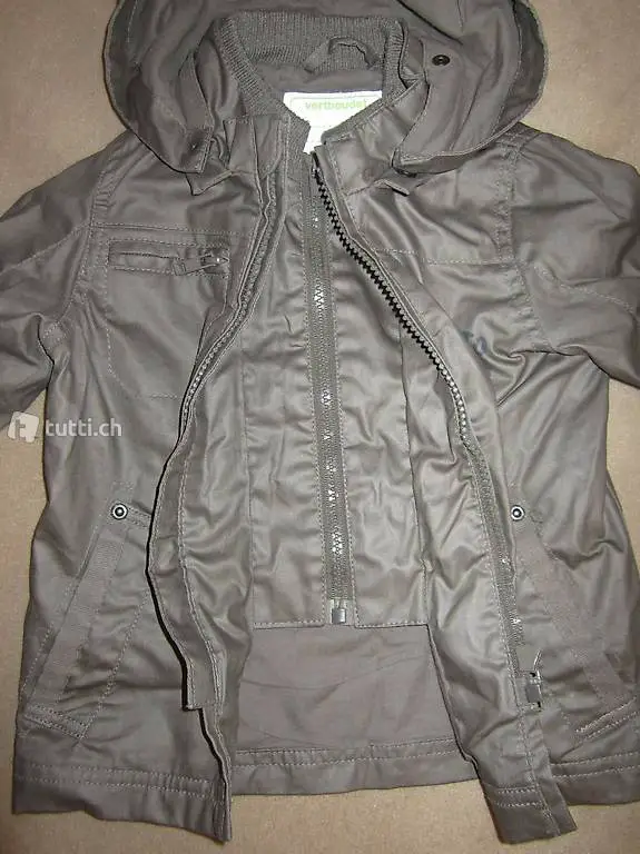 Die Jacke hat eine Kapuze, die man wegnehmen kann. Die Jacke kann auch bei leichtem Regen getragen werden.