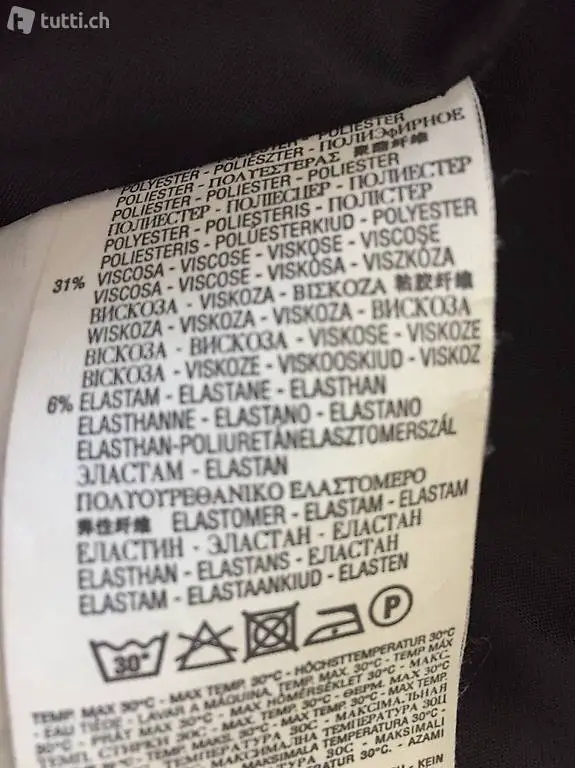 - 63% Polyester, 31%Viscose, 6% Elastan