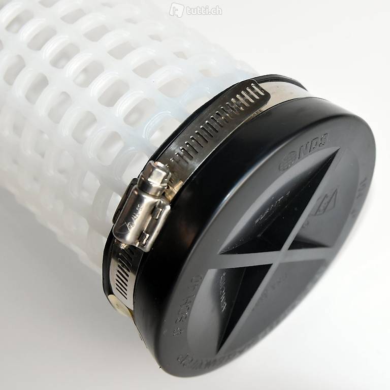 Am Ende ist das Siebrohr durch eine Flexible Endkappe Ø110 mm (4") gesichert, jeweils mit Edelstahl Schraubschellen versehen. Das Filtersiebrohr kann aufgrund der Lochgrösse von 10 - 12 mm nicht verstopfen und bietet ausreichende Sicherheit, damit die ansaugende Pumpe nicht trockenläuft.