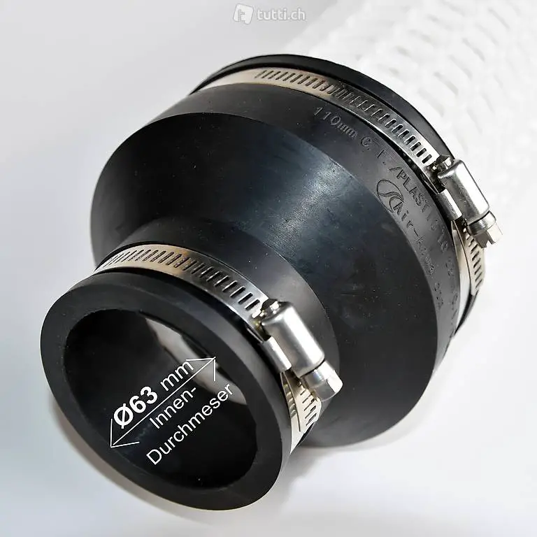 Am Anfang ist eine Flexible Reduziermuffe von Ø110 mm (4") auf Ø 63 mm (2") mit optimierten 45° Strömungsverlauf verbaut.