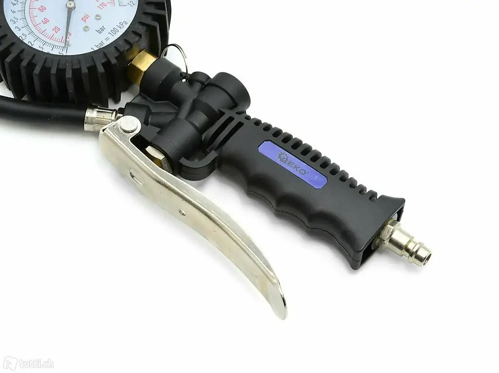 Druckluftpistole mit Manometer - zum Aufpumpen der Räder von PKW und LKW. Ausgestattet mit einem flexiblen Schlauch mit einer Länge von 45 cm und einem grossen, lesbaren Manometer in einer Gummiabdeckung zum Schutz vor Stössen und Stössen . Messskala in zwei Einheiten - Psi und Bar . 1/4 " Schnellanschluss ermöglicht eine schnelle Verbindung zum