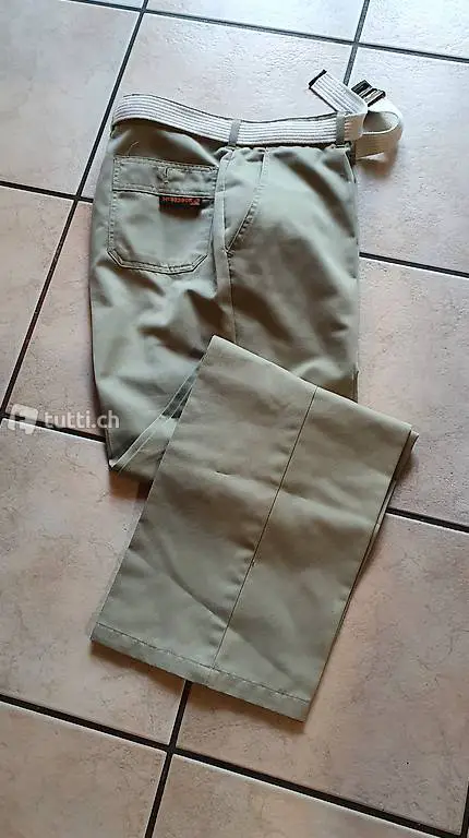 Bundumfang 90 cm, Länge 101 cm. 2 Taschen vorne und 2 hinten mit Knopf. Farbe Lindengrün. Alles in einem sehr guten Zustand.