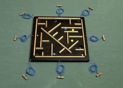 Dieses Brett mit je einem Labyrinth auf beiden Seiten, erfreut sich bereits grosser Beliebtheit. Da die beiden Seiten einen unterschiedlichen Schwierigkeitsgrad aufweisen, lassen sich fast unbegrenzt Aufgaben zur Team- und Führungsentwicklung kreieren. Das Brett wird von den Teilnehmenden (max. 16) an den Schnüren in der Schwebe gehalten und dabei gilt es, eine oder mehrere Kugeln durch das Labyrinth zu bewegen.