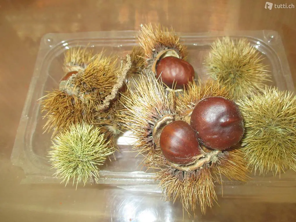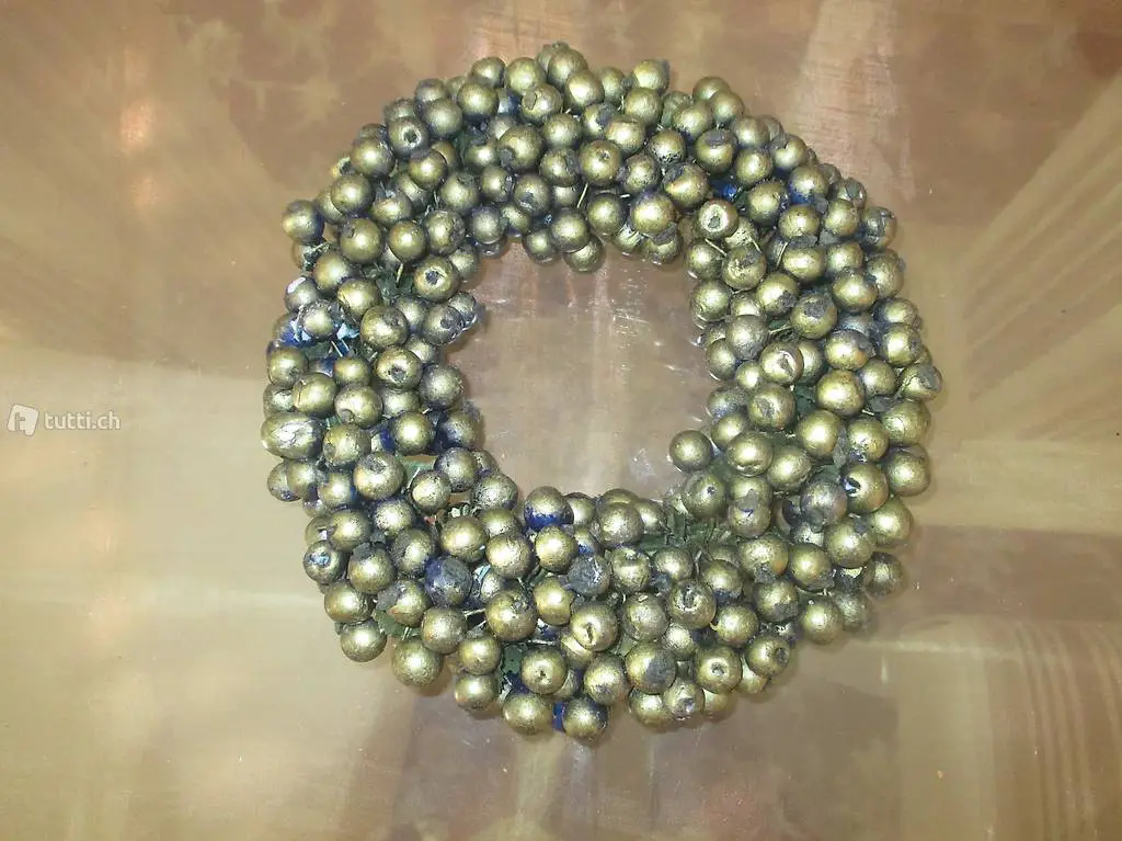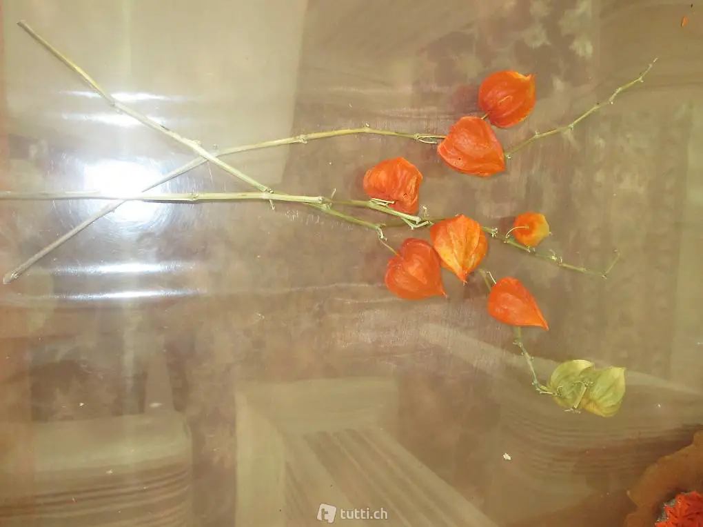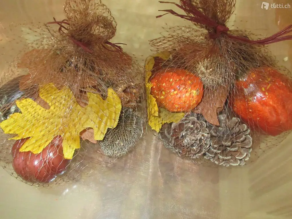 Tischdekoration. Ø ca. 20cm; viele echte Marroni- Schalle; 2 Sets mit verschiedenen kleinen Zapfen, künstlichen Arhorn Blätter, Holzscheiben, künstlichen Früchten; Lampionblumenzweigen.
