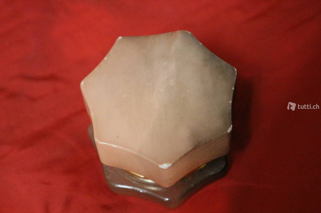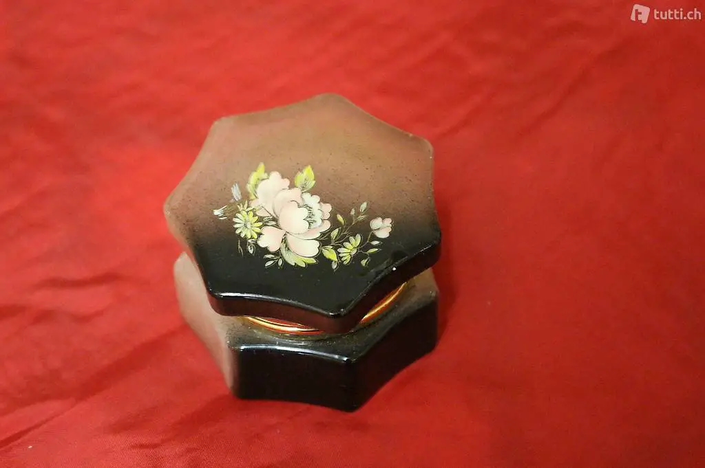 Hübsches 7-eckiges Döschen, marmorfarbig lackiert, Deckel mit Blumenmotiv, Ringe goldfarbig. Die Dose besteht aus relativ weichem Material, sodass die Ecken an der Unterseite leider beschädigt sind. Beschädigungen nur unten sichtbar. Drm. innen 5 cm, Höhe 3,5 cm. Preis exkl. Fr. 7.- Porto (Bei Posteinzahlung + Fr. 1.50 Spesen) . Kann nach Absprache auch in 8494 Bauma abgeholt werden.