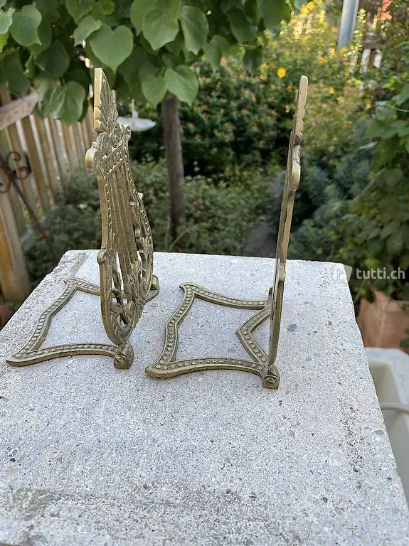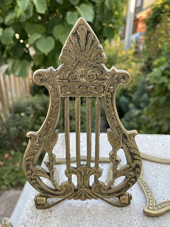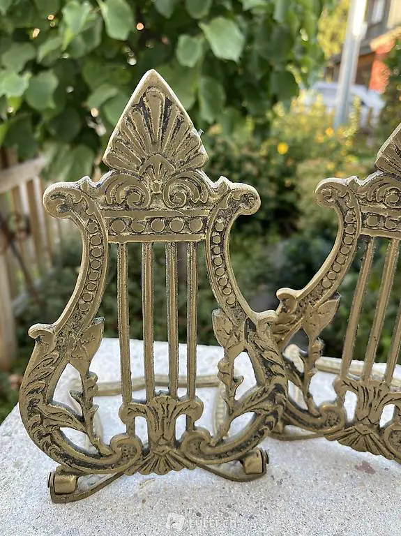 wunderschöne und gut erhaltene antike Messing Bücherstützen in Form einer Lyra. Höhe 16.5 cm, Breite 11 cm,
