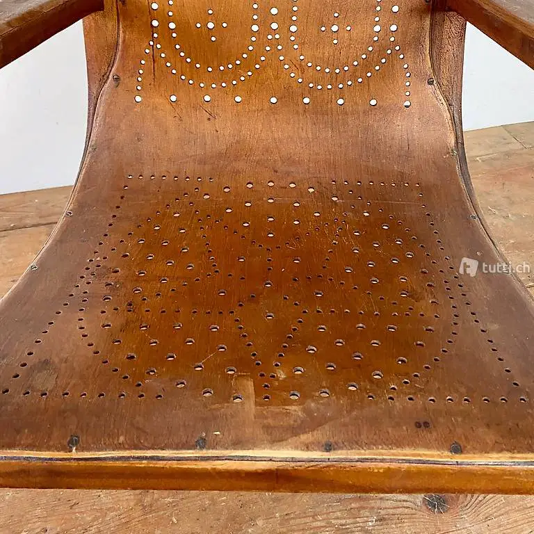 Birkensperrholz mit Lochmuster. Die Sitzhöhe ist ca. 50cm hoch.