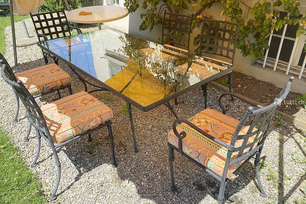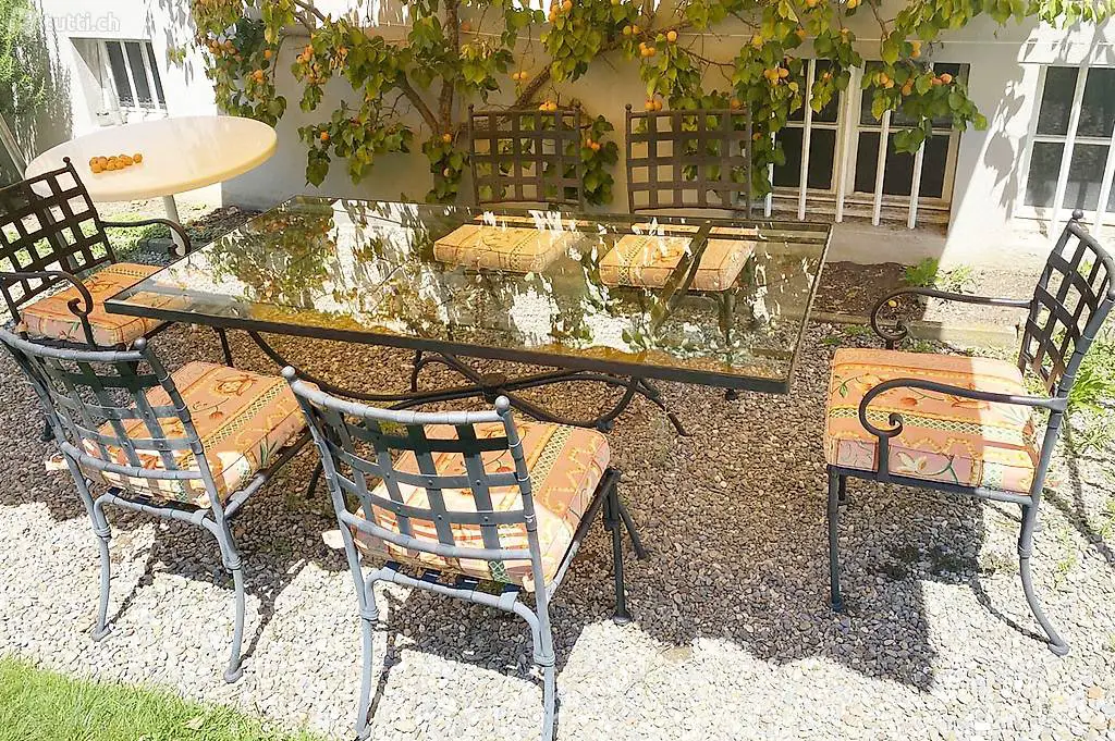 Tisch ist 180 cm Lang, 90 cm Breit und hat eine Tiefe von 90 cm. Das schöne Set aus Schmiedeeisen ist einem guten Zustand.