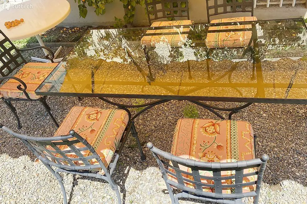 Glasplatte und 6 Eisenstühlen mit Polster. Der