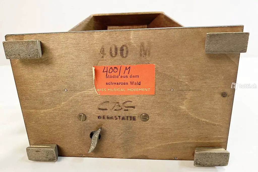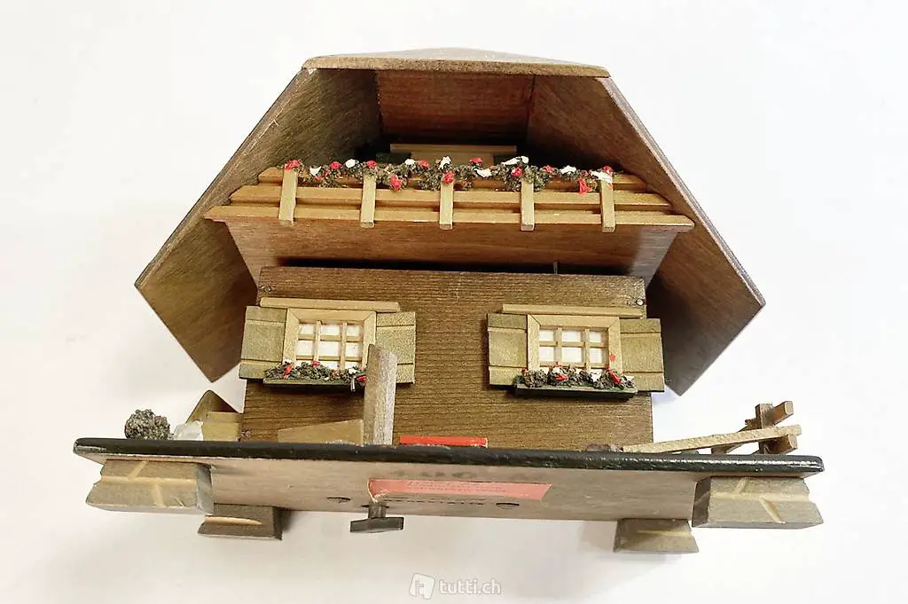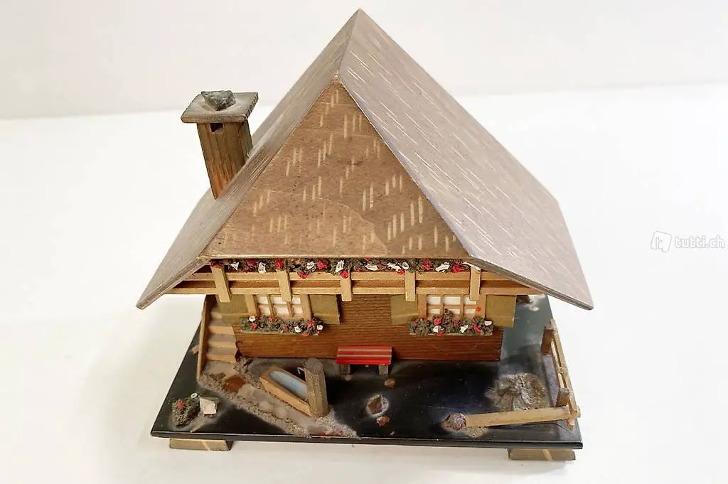 Musikdose von Reuge. Das kleine Häuschen spielt die Melodie 'Mädle aus dem schwarzen Wald'.