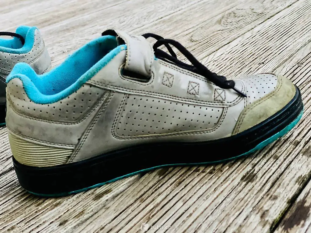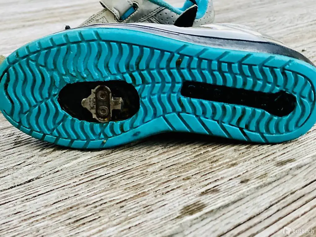 Gebrauchter aber völlig intakter Herren Bikeschuh für SPD Klickpedal. Farbe: Grau/blau. Gebrauchsspuren an der Seite. Schnür und Klettverschluss. Grösse 42.5 US 9.5) .