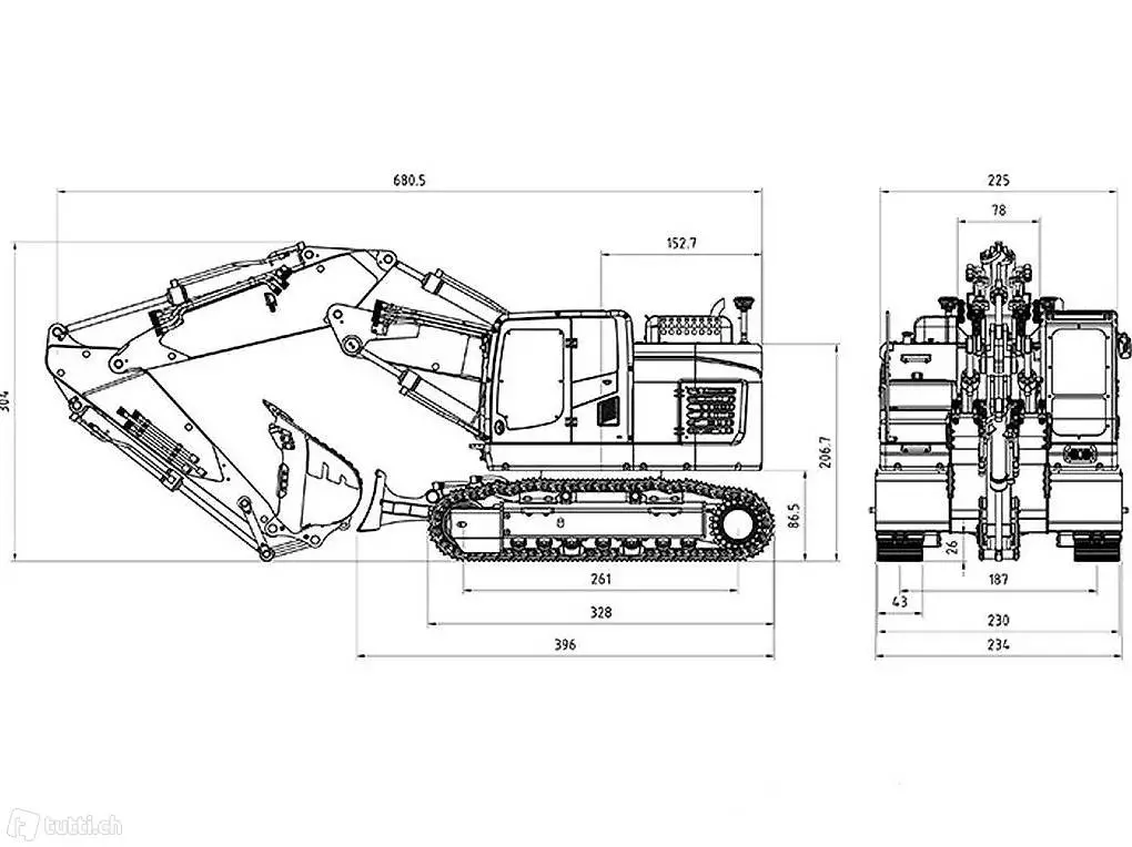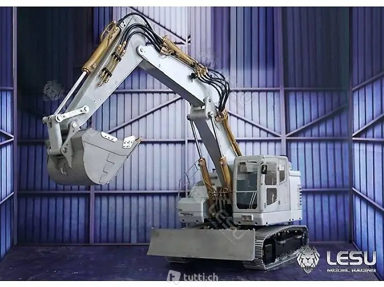Massstab 1:14. Gefertigt aus Edelstahl, Messing und Aluminium. Der Bausatz wird inklusive Motoren, Hydraulikanlage mit Brushless-