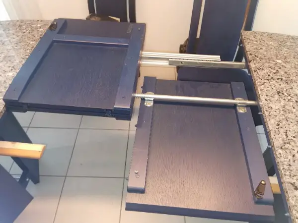Esstisch ausziehbar (Holz blau, Marmorplatte, 2 Einlegeplatten)