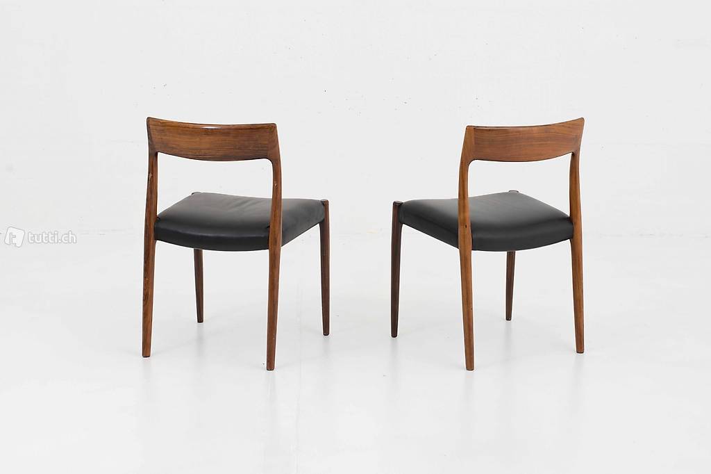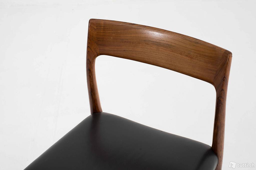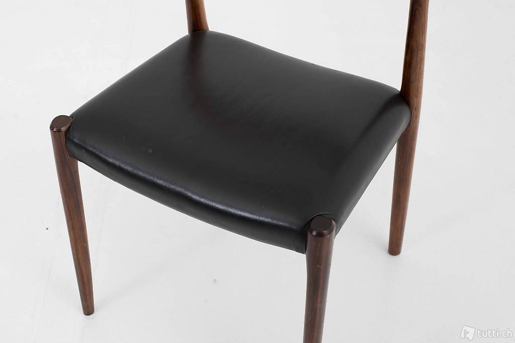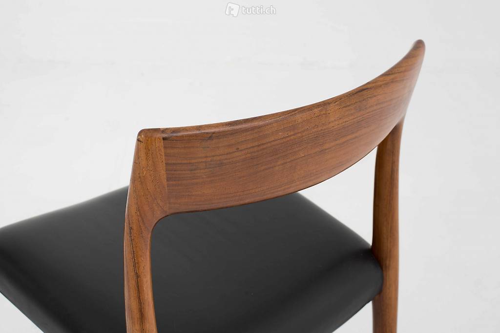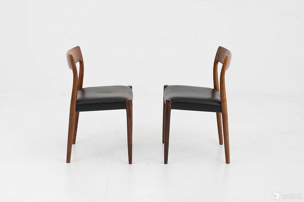 Der dänische Möbeldesigner Nils Møller gründete im Jahr 1944 die J.L. Møllers Möbelfabrik, produzierte die Entwürfe und leitete die Produktion. Der elegant geschwungene Stuhl aus Palisander mit Ledersitzfläche ist ein Entwurf aus dem Jahr 1959 und wirkt luftig und elegant zugleich. Die Stühle befinden sich in einem guten Zustand mit leichten Gebrauchsspuren. Preis gilt für das Zweierset.