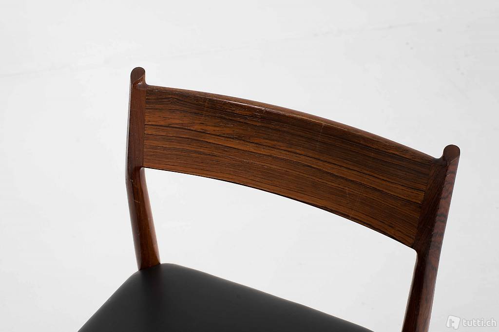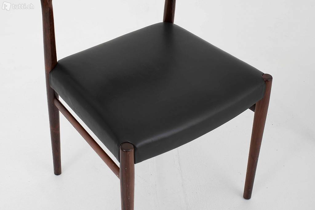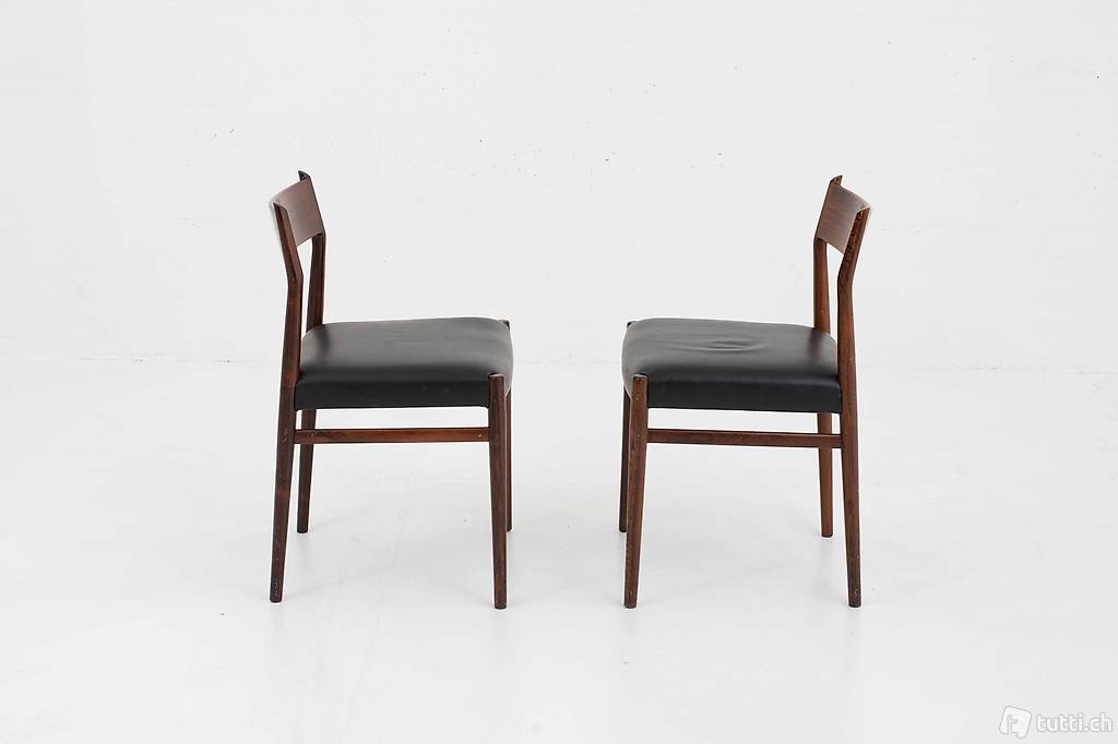 Den Stuhl Nr. 418 entwarf Arne Vodder in den 1960er Jahren für Sibast Furniture, Dänemark. Der elegant geschwungene Stuhl aus Palisander mit Ledersitzfläche wirkt luftig und elegant zugleich. Die Stühle befinden sich in einem guten Zustand mit leichten Gebrauchsspuren. Preis gilt für das Zweierset.