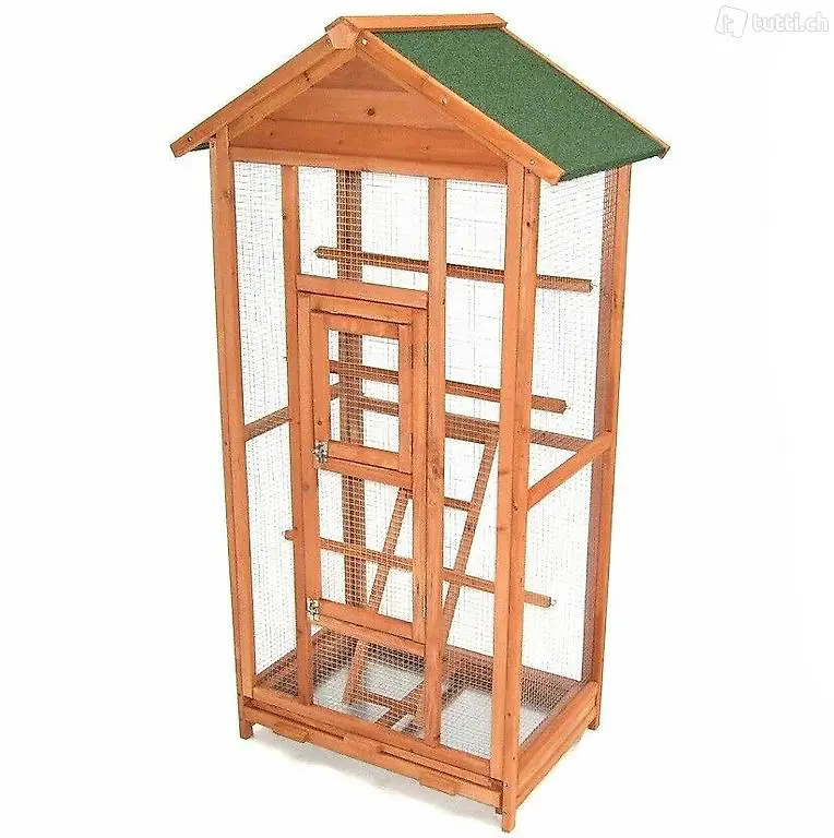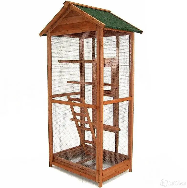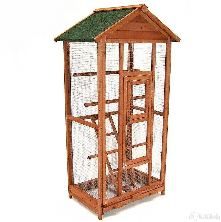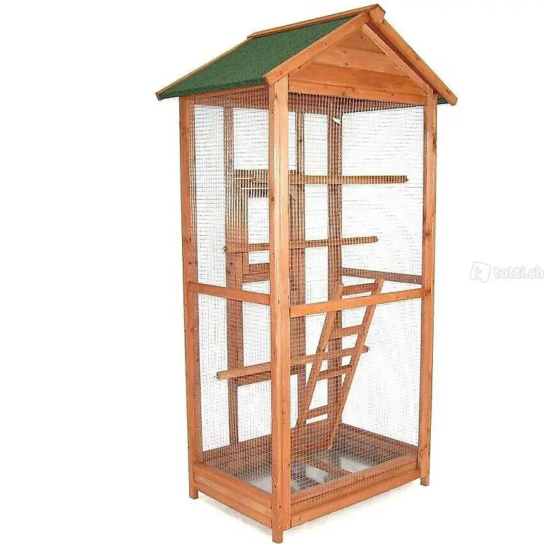 Die grosszügige Vogelvoliere besteht aus ausgewähltem Holz mit einer wasserfesten braunen Lasierung.