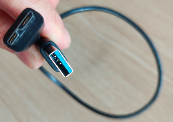 - Ein schwarzes USB-Kabel zum Anschluss von externen Festplatten. Länge knapp 39 cm.