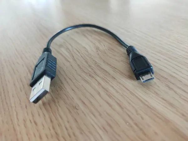 - Zwei schwarze USB-Kabel zum Laden von Peripheriegeräten. Länge 13 cm.