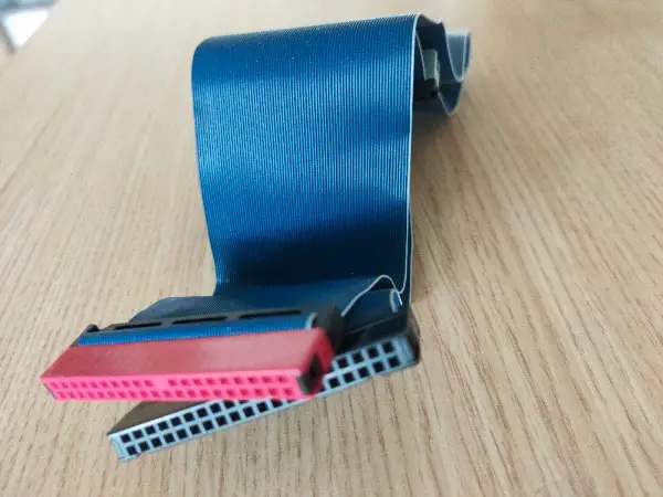 - Ein blaues ATA-Kabel. Es dient der Verbindung von IDE-Laufwerken mit dem Motherboard. Es ist 47 cm lang. Bei 1/3 der Länge befindet sich eine Zwischenbuchse. Der Hersteller ist Gigabyte. Ich habe es nie verwendet, so dass es neu ist.