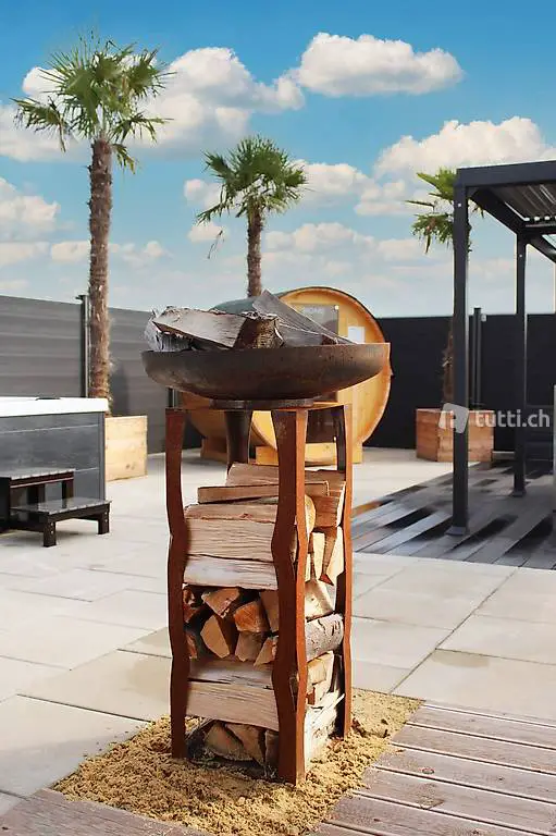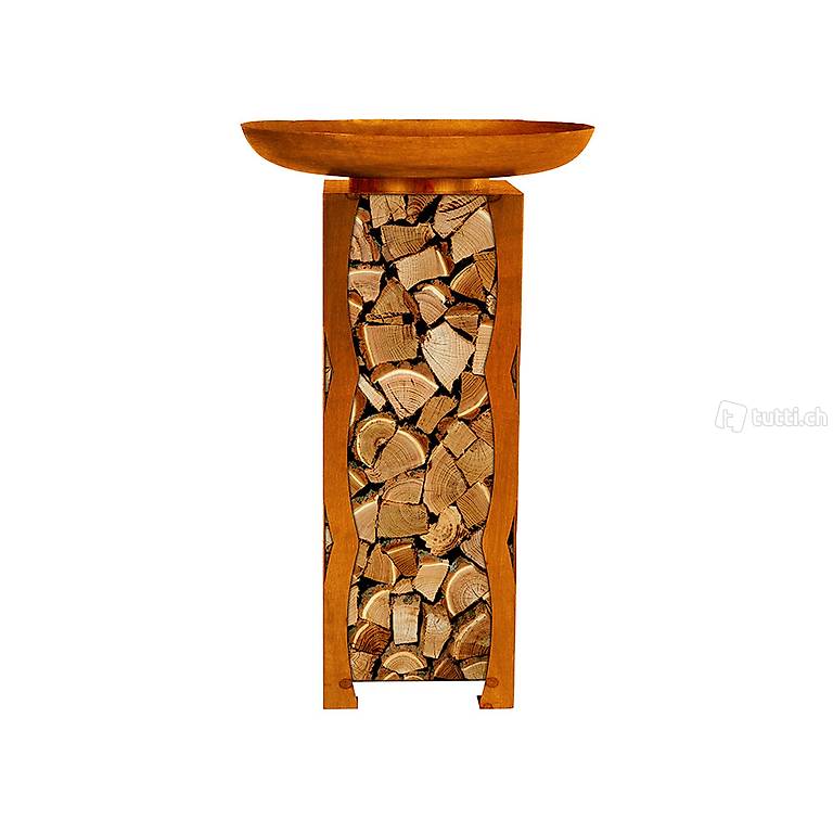 Die Feuerschale Frank ist vielseitig gestaltet und bietet neben dem ansprechenden Design ein grosszügiges Lager für ihr Brennholz.