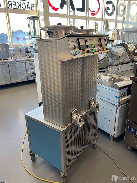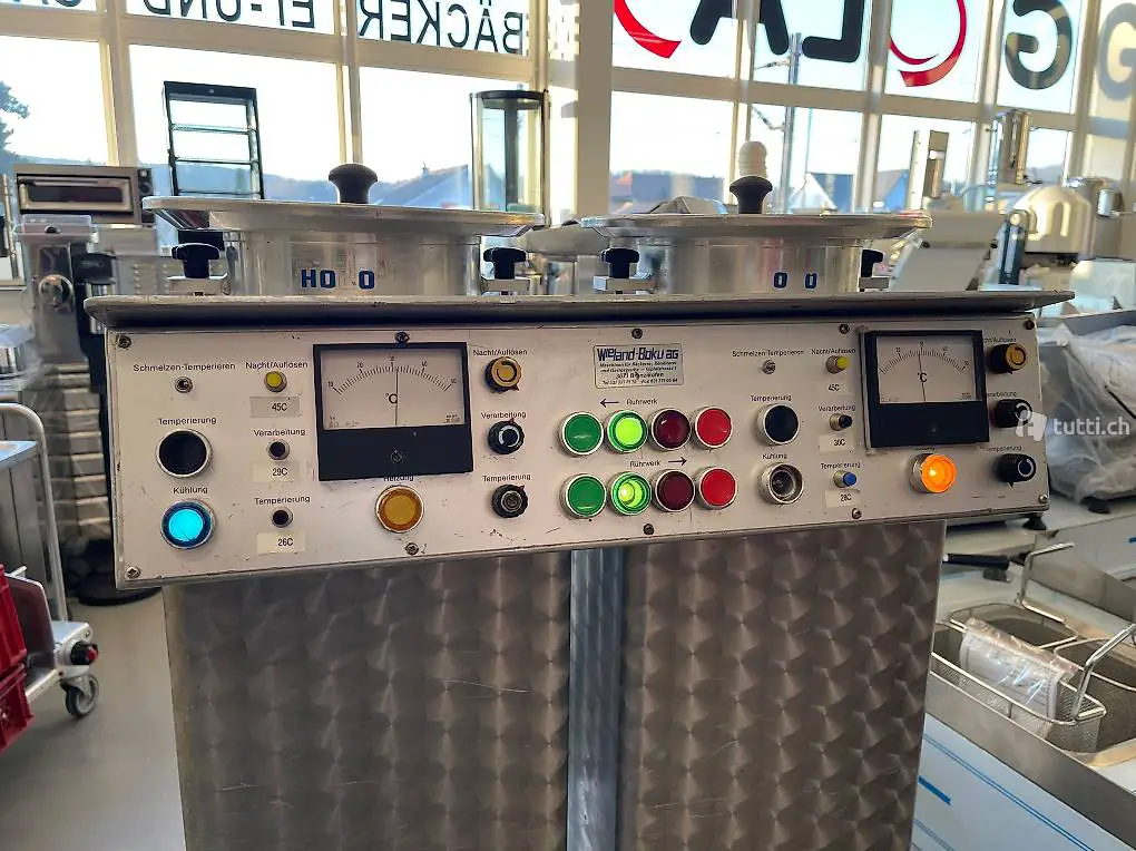 Diese automatische Maschine, in der die Schokolade für Überzug, manuelles Eintauchen und zum Formengiessen geschmolzen, gekühlt, temperiert und aufbewahrt wird, ist komprossorgekühlt.