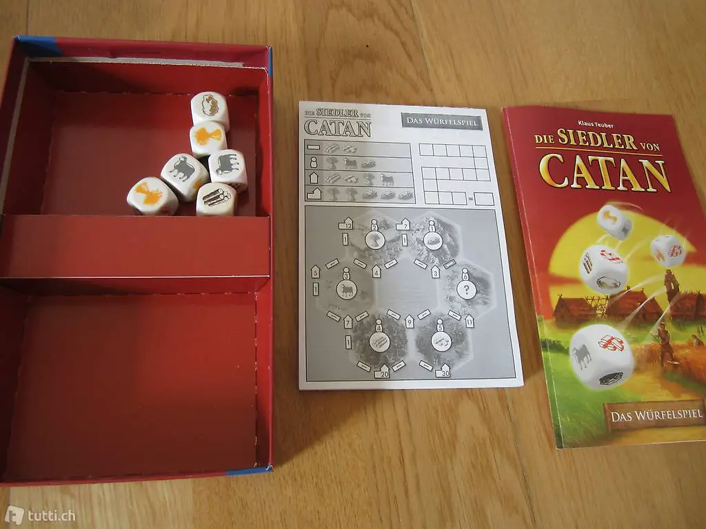 Siedler von Catan an. Für 1-4 Spieler, Alter ab 7 Jahre. Beim Block fehlen 8 Blätter. Es sind noch 52 Blätter vorhanden. Verkauft wird was auf den Bildern zu sehen ist.