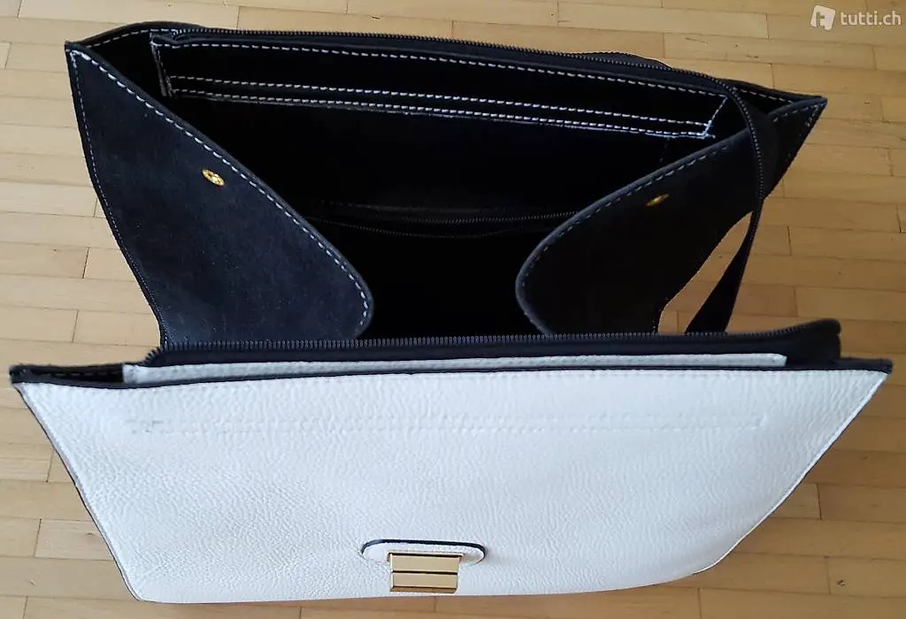 und Klappe. Innentaschen: 1 mit Reissverschluss. Goldbeschläge. Masse ca. H: 29 cm / L: 51 cm / B: 17 cm (Preis exkl. Porto und Verpackung) .