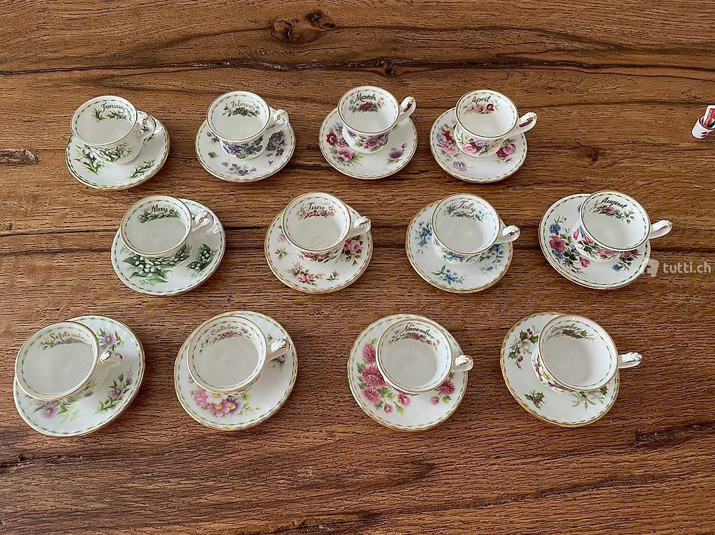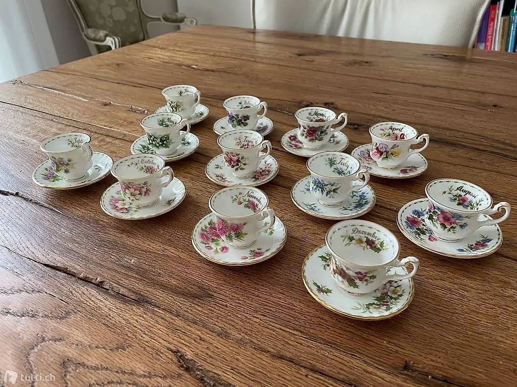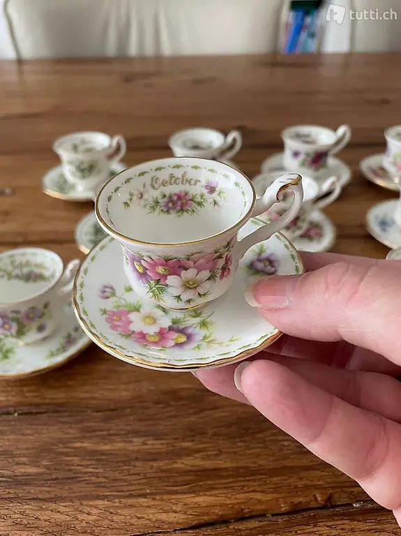 -Tassen mit den Blumen der Monate Januar bis Dezember. Dazu ein Mini Kaffee-Service.