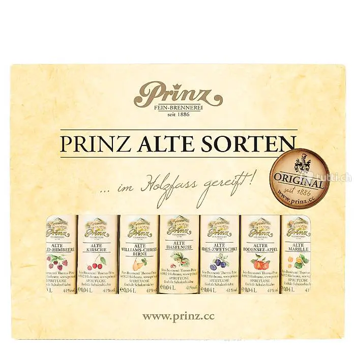 Die aromaschonend gebrannten Obstdestillate dürfen doppelt reifen: Erst bis zu 6 Jahre im Steingut und danach bis zu 2 Jahre in sorgfältig ausgewählten Prinz-Holzfässern. Somit dauert es teils acht Jahre bis eine Frucht als Alte Sorte abgefüllt wird. Die Qualität und Sorgfalt können Sie mit jedem Schluck schmecken.