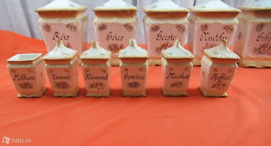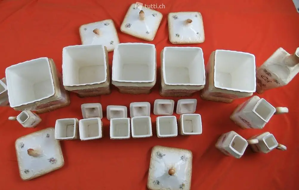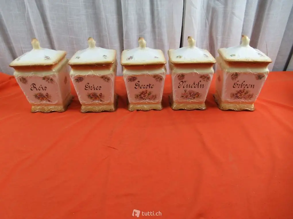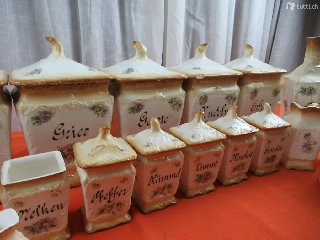 17 verschiedene Vorratsdosen aus Porzellan im gebrauchten Zustand. Leider fehlt bei einen Behälter der Deckel. Als Grössenvergleich. Die Ölkanne ist 23 cm hoch. Kein Einzelverkauf.
