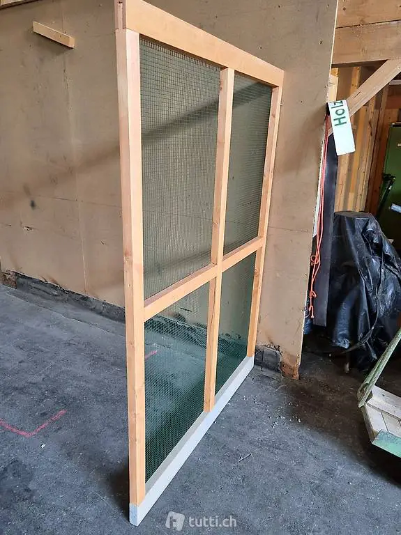 Der Rahmen ist mit plastifiziertem Casanetgitter grün beplankt, Maschenweite 12.5 x 12.5 mm (Mardersicher)