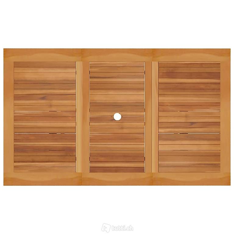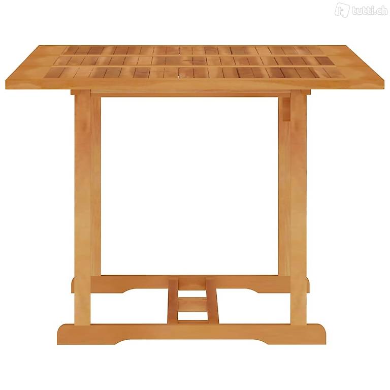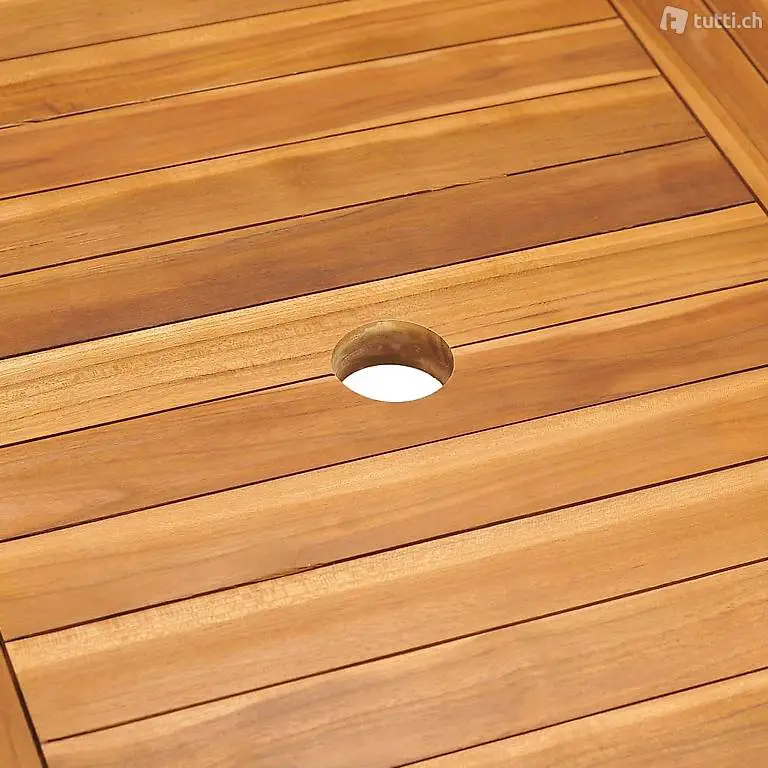 Dieser hölzerne Gartentisch verfügt über ein elegantes Design und ist eine ausgezeichnete Wahl für den Innen- und für den Aussenbereich. Das für dieses Möbelstück verwendete Teakholz ist technisch getrocknet und anschliessend fein geschliffen worden, um eine sehr glatte Textur aufzuweisen. Teakholz ist für seine aussergewöhnliche Festigkeit und Witterungsbeständigkeit geschätzt und eignet sich daher besser für Gartenmöbel als jede andere Holzart. Massives Teakholz ist die perfekte Wahl, wenn Sie ein langlebiges Gartenmöbel haben möchten. Dank der geschliffenen Oberfläche ist der Esstisch witterungsbeständig und pflegeleicht. Die Tischplatte ist mit einem Schirmloch versehen, um die Sommerbrise unbekümmert geniessen zu können.