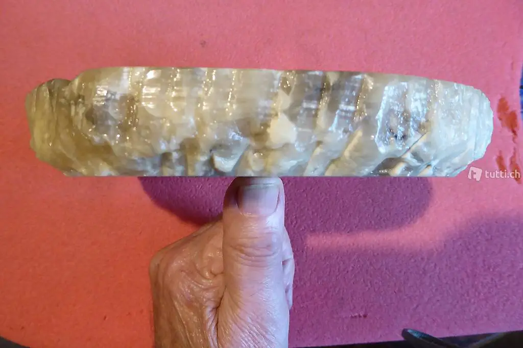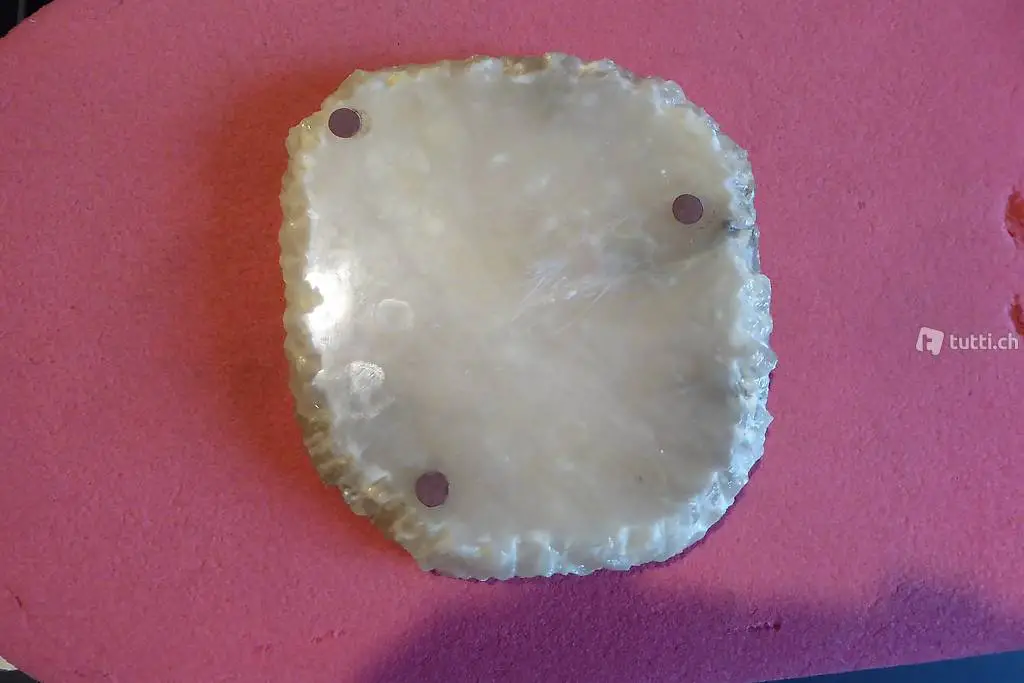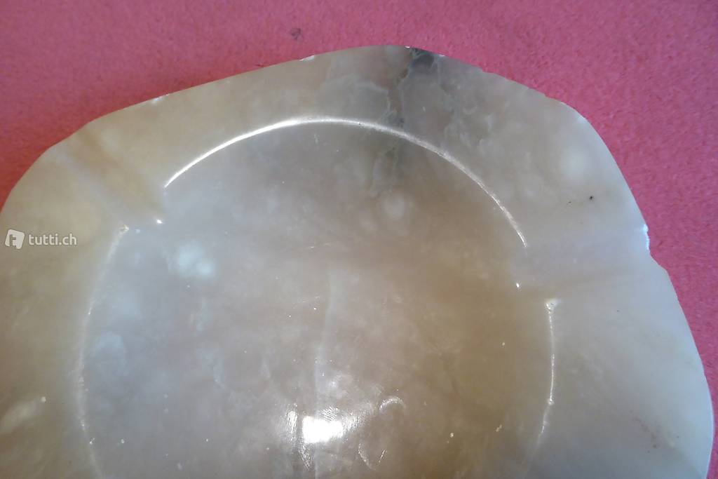der Aschenbecher ist aus weissem Marmor mit Einschüssen wie Bilder zeigen Grösse ca. 17x18cm. Dicke 28mm hat ein Gewicht von 1329gr.