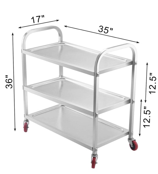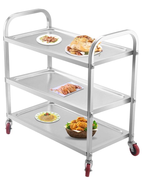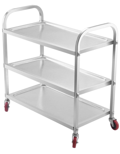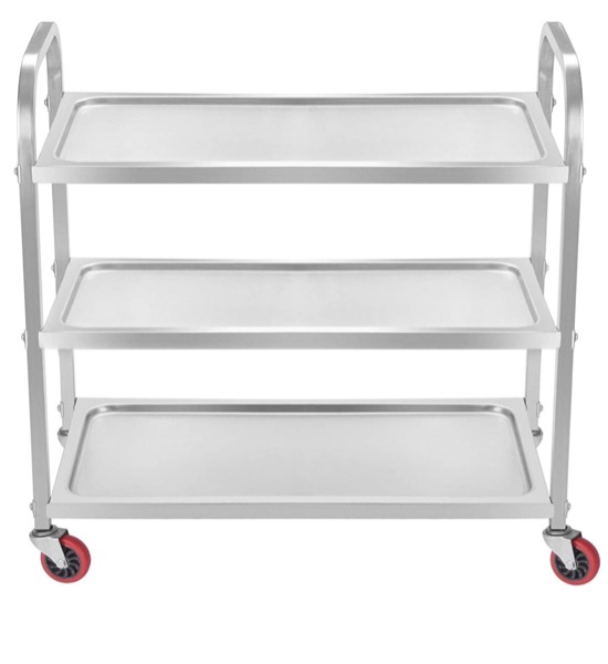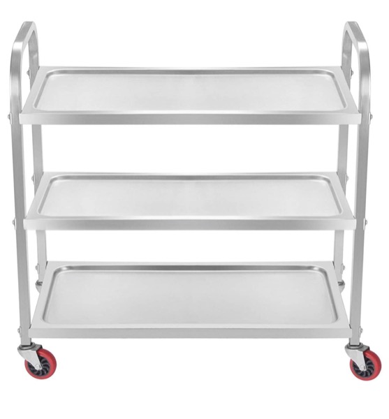 Küche und aus Edelstahl gefertigt, langlebig und robust zu bedienen. Drei Regale mit einer Tragfähigkeit von jeweils 50 kg, ideal für kleine Küchen. Es verfügt über zwei Lenkrollen für Manövrierfähigkeit und zwei Feststellrollen für Sicherheit, die das Rollen und Anhalten überall erleichtern. Ideal für zu Hause, Krankenhäuser, Kantinenküchen, Restaurantküchen, Flughäfen und Clubs.