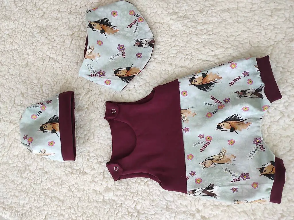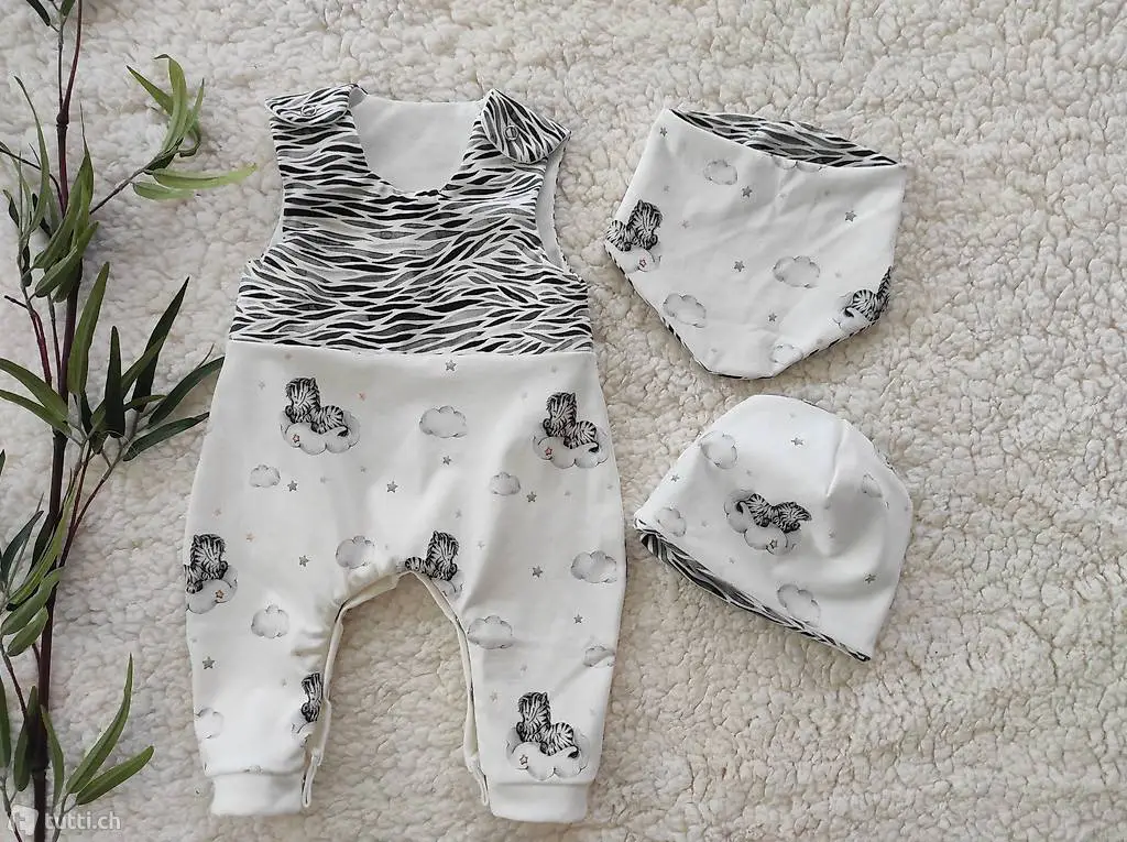 SelbstgemachtesGeschenkset mit Löwen. Bestehend aus Strampler mit Druckknöpfen oben und an den Beinen für einfaches wechseln der Windeln, Mütze und Sabbertuch, auch mit Druckknopf. Kann auf Wunsch mit Name und Motiv personalisiert werden. Aus Rauch und tierfreiem Haushalt. Habe noch viele andere Kleider. Einfach anfragen. Stoffelfe.